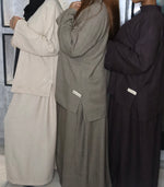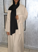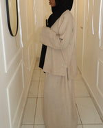 La coupe ample et minimaliste du haut et la jupe longue fluide créent une silhouette modeste et très tendance. Sa couleur beige clair lumineux est riche et intemporelle, faisant de cet ensemble la base idéale pour un style chic au quotidien